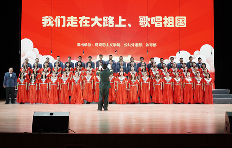 马克思主义学院、公共外语教研部、体育教研部教师带来了豪迈的《我们走在大路上》,整首歌曲节奏强烈,传达出革命军人奔向美好生活的坚定信念。同时,他们带来的另一首歌曲《歌唱祖国》也让现场师生感受到了师生对伟大祖国的祝福之情。