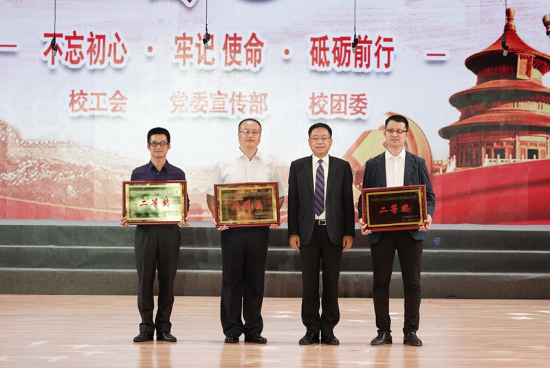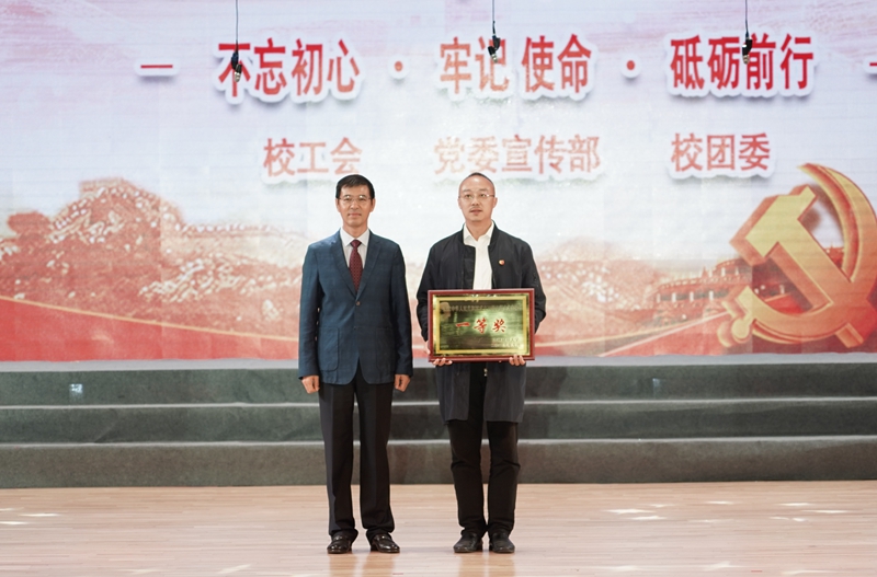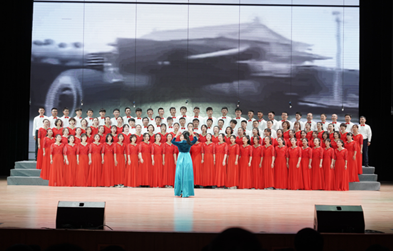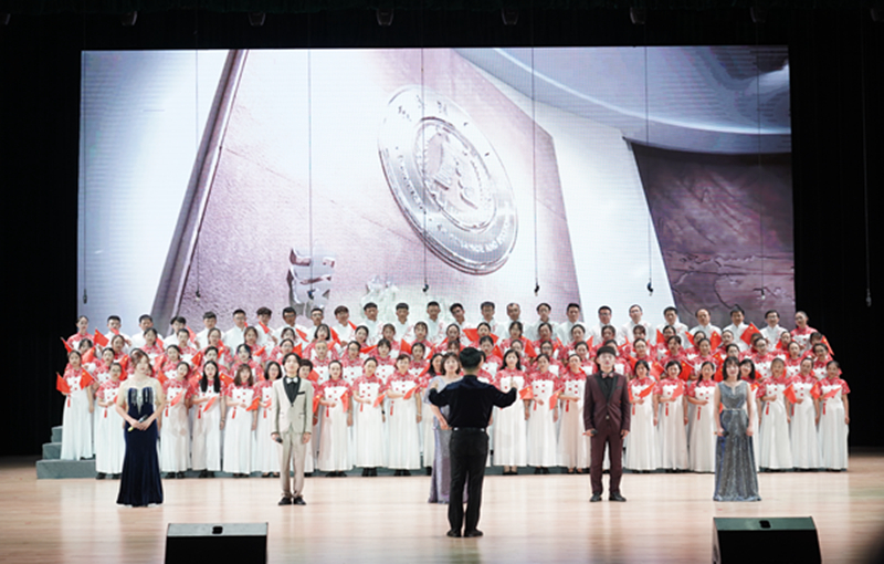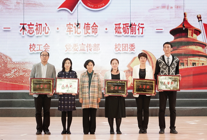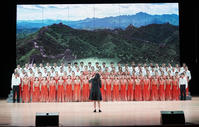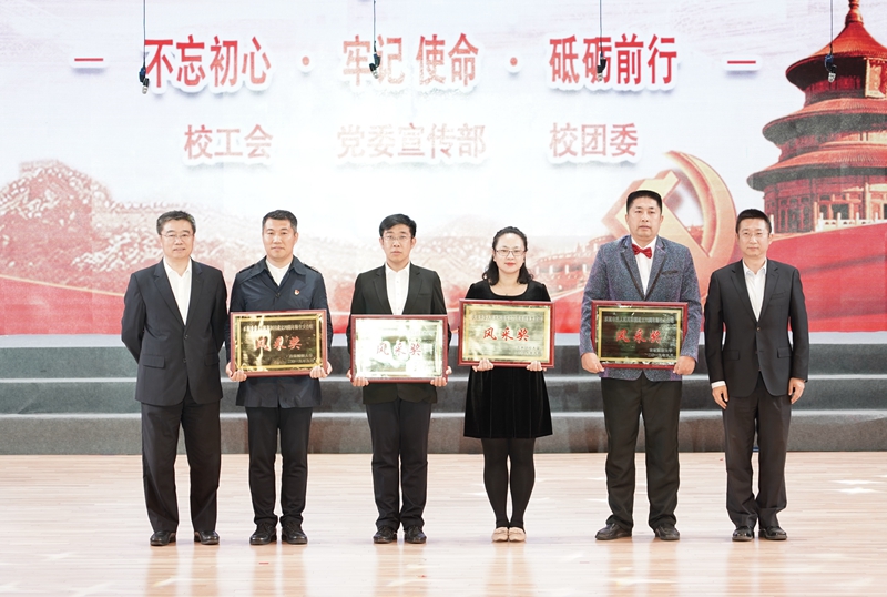 机关党委、图书馆、校医院联合合唱团演唱了《不忘初心》和《中国中国鲜红的太阳永不落》。动人的旋律和朴实真挚的歌词,诉说着中华儿女与祖国血肉相连的深情,更表达了中国共产党为中国人民谋幸福、为中华民族谋复兴的初心和使命。
