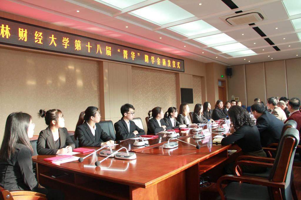 仪式上,黄建东宣读了“菁华”助学基金获奖学生名单。崔少华为受助学生颁发吉财“菁华”助学金、获奖证书以及少华校友亲笔签名的鼓励信。