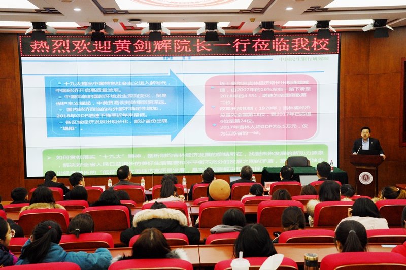 本网讯(学生记者 张明馨 摄影 闫靖涵)应经济学院邀请,12月25日下午,中国民生银行研究院院长黄剑辉教授率领研究团队以《迈向2049的吉林——强化市场,开放包容的战略思维》为题为Beat365师生举行了一场别开生面的报告会。