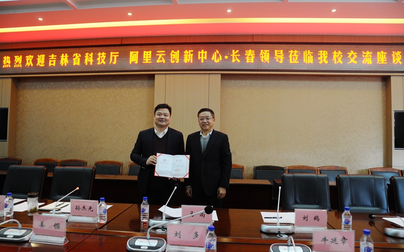 交流座谈会上,校党委副书记、校长孙杰光向阿里云创新中心·长春总经理姜镪颁发了学校创新创业导师聘书。