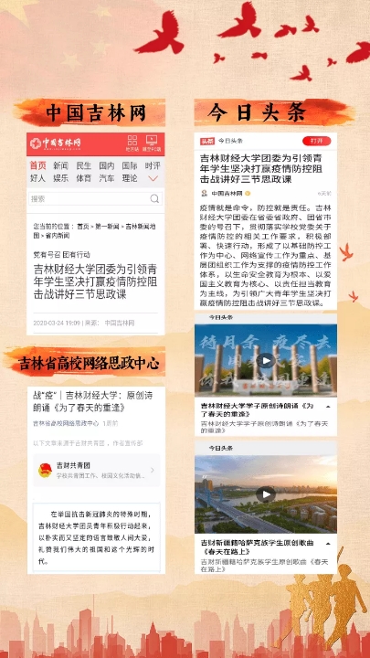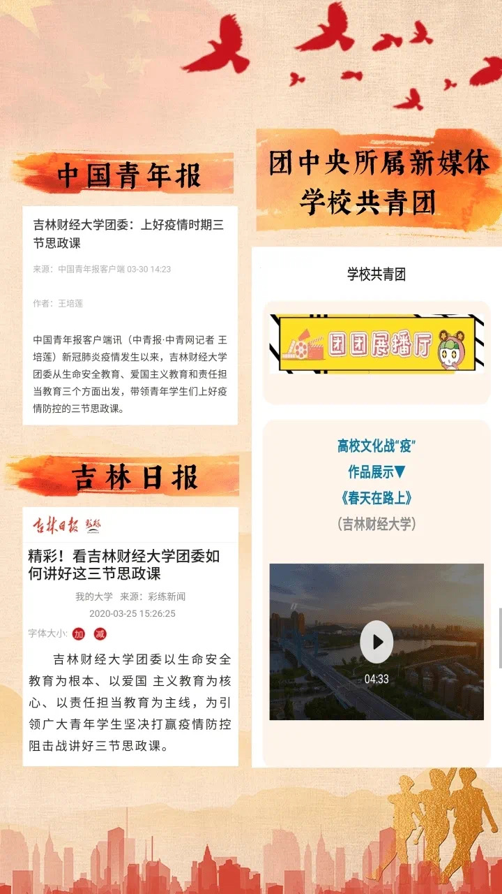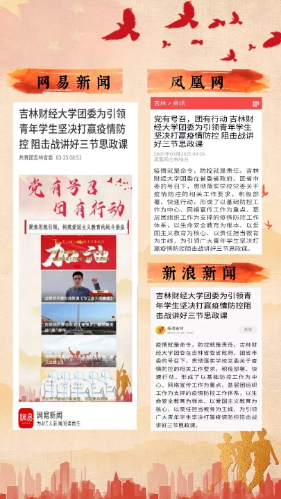 “Beat365唯一官方网站团委为引领青年学生坚决打赢疫情防控阻击战讲好三节思政课”的战疫抗疫工作做法在“Beat365唯一官方网站”和“吉财共青团”微信平台推出后,引发了社会新闻媒体的广泛关注,先后被中国青年报、团中央所属新媒体、吉林日报、学习强国、中国吉林网、吉林省高校网络思政中心、今日头条、网易、凤凰网、新浪等20余家主流新闻媒体和网络新媒体报道。(审核人 刘成立)