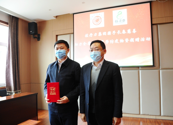 随后,佐丹力集团董事长韩丹与长春市慈善会会长祝业精进行了捐赠交接。
