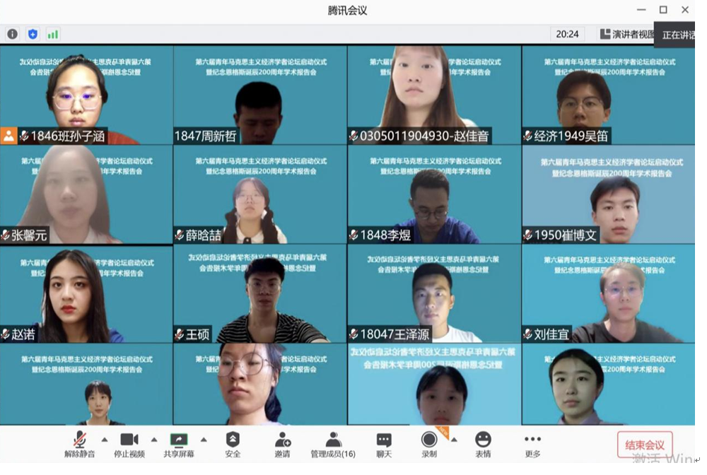 学术报告之后,孙杰光校长发表讲话。他首先感谢丁堡骏教授做了一场融思想性和专业性为一体的既精炼又精彩的学术报告,丰富了本次论坛的内容,更好的引导青年学生深入学习马克思主义的经典原著。同时,对经济学院青马论坛活动的深入开展及对青年学子在马克思主义理论学习和科学研究中的不懈探索予以充分肯定。接着,他与大家缅怀了恩格斯的伟大人格和丰功伟绩,回顾了恩格斯与马克思之间的伟大友谊,在此基础上带领大家重温了2018年习近平总书记在马克思诞辰200周年纪念大会上讲话的经典片段,并从正确处理人与自然辩证关系的角度,阐述了在这次抗击新冠肺炎疫情的斗争中,如何进一步彰显了马克思主义为什么行、中国共产党为什么能、中国特色社会主义为什么好和中国特色社会主义的制度优势。他希望全校的青马学子要进一步加强马克思恩格斯经典原著学习,并要与深入学习习近平新时代中国特色社会主义思想贯穿起来,与学习党史、新中国史、改革开放史、社会主义发展史、东北振兴史、74年办学历史贯穿起来,在学思践悟中坚定理想信念,在奋发有为中践行初心使命,心有所信,行稳致远。他鼓励经济学院青马论坛活动在活动设计、组织安排、社会实践等方面勇于创新,更好的“辐射”到全校学生中去。最后,孙校长引用恩格斯的著名预言,“只要进一步发挥我们的唯物主义论点,并且把它运用于现时代,一个强大的、一切时代中最强大的革命远景就会立刻展现在我们面前”。