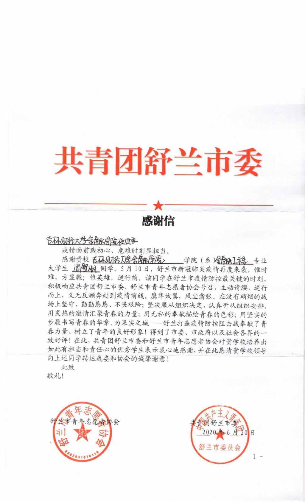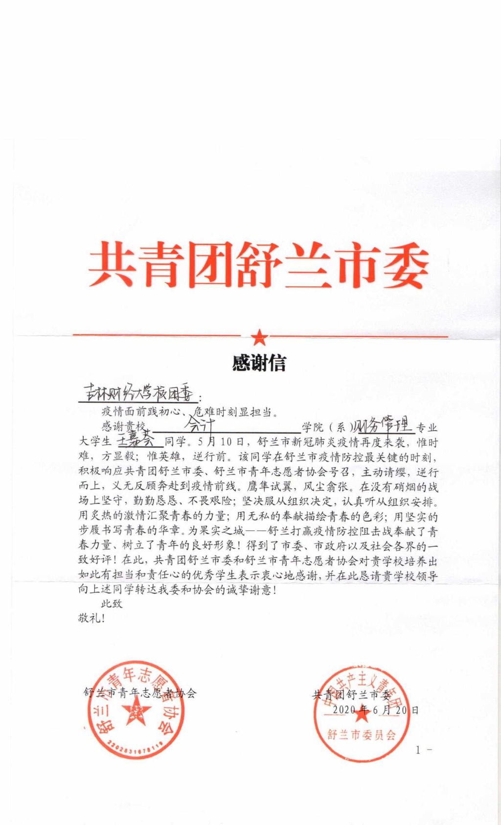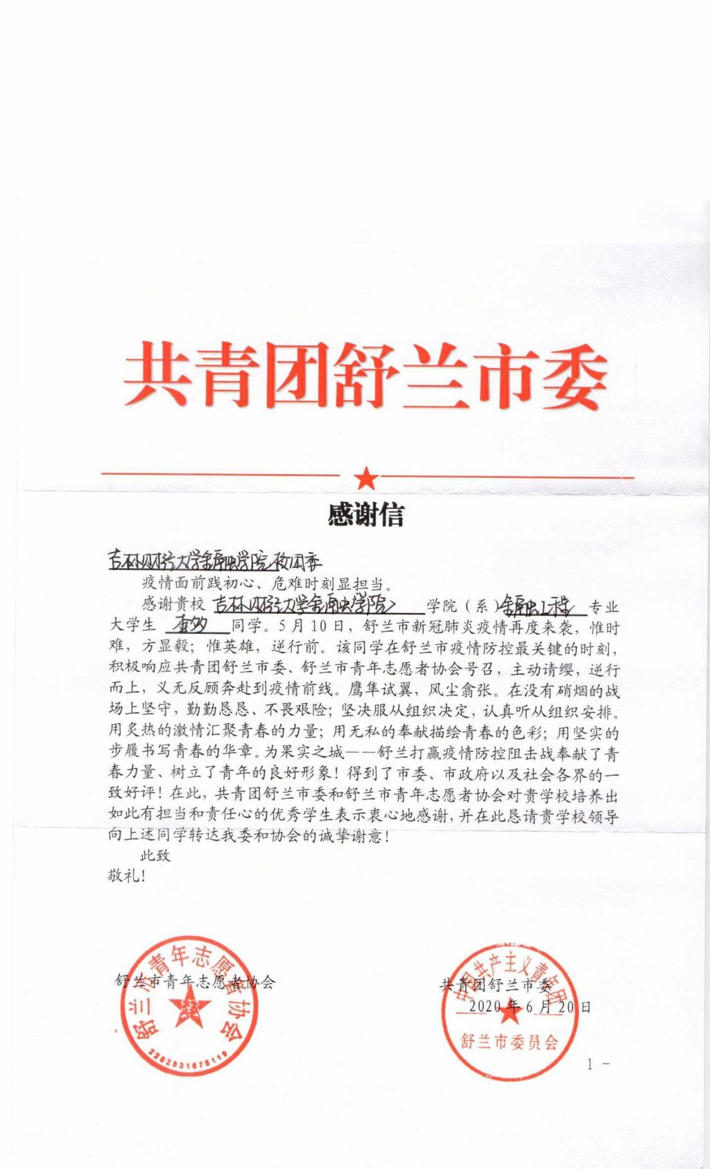 本网讯(校团委 供稿)近日,Beat365相继收到共青团舒兰市委、共青团白山市委多封感谢信。在信中,共青团舒兰市委、舒兰市青年志愿者协会、共青团白山市委等单位对Beat365在人才培养、思想引领、成才服务等方面工作给予了高度评价,对Beat365学生在打赢疫情防控阻击战过程中勇挑重担、勇克难关、勇斗风险的高贵品质给予了充分肯定。