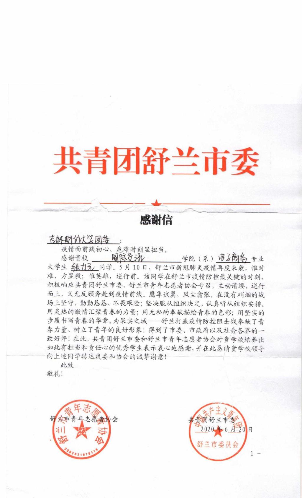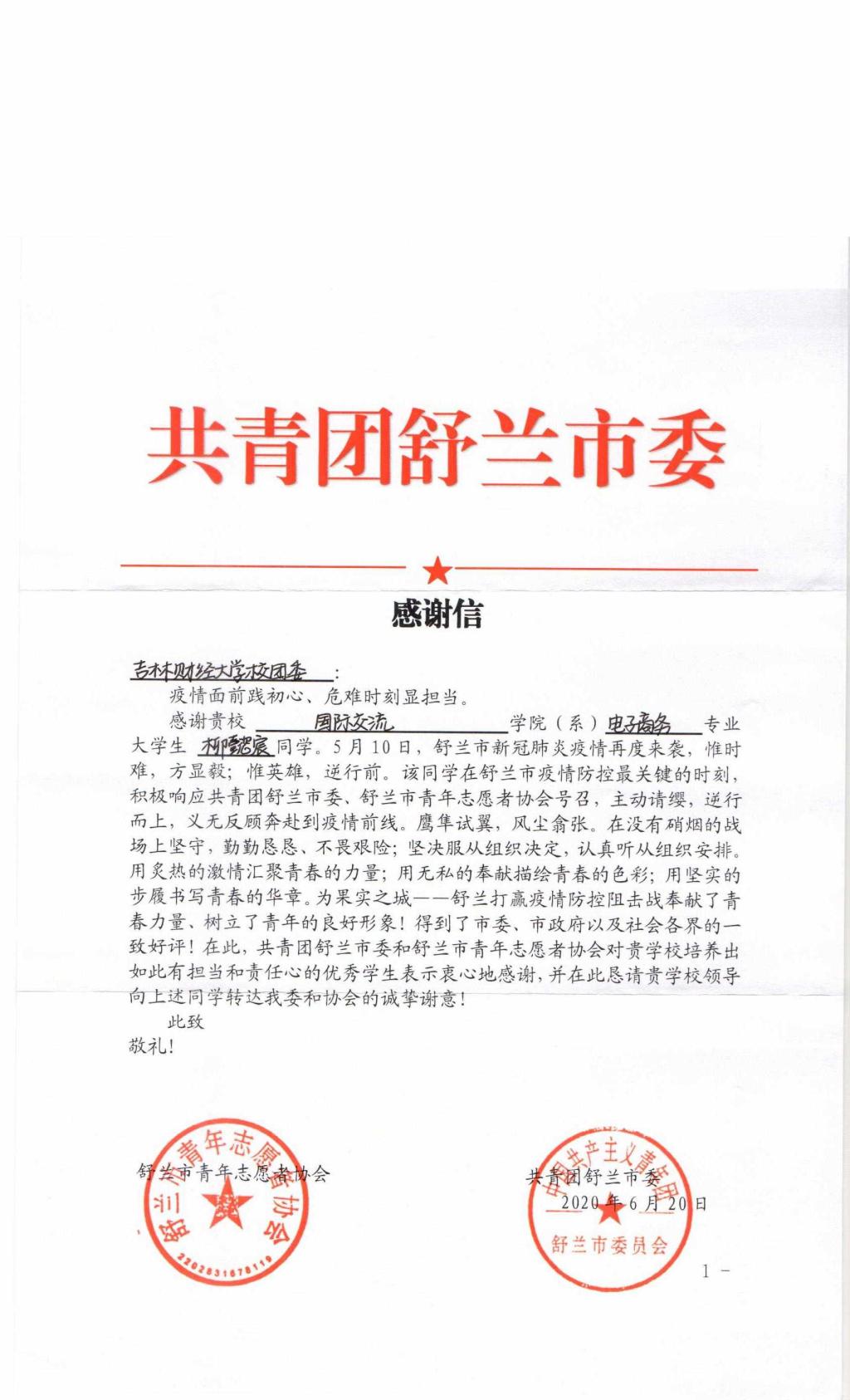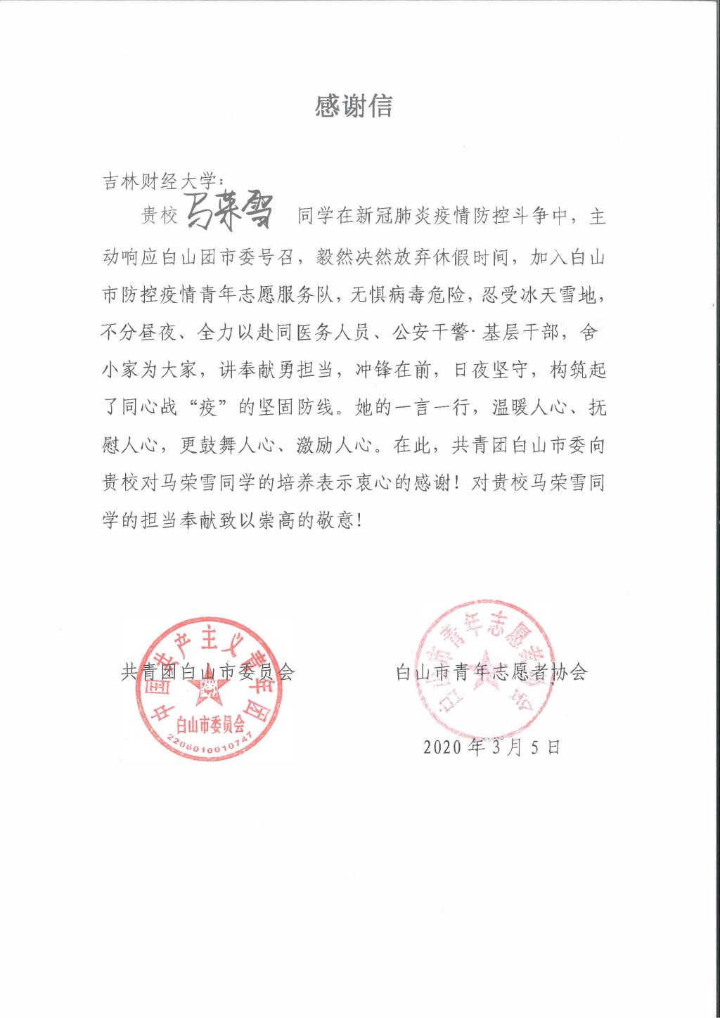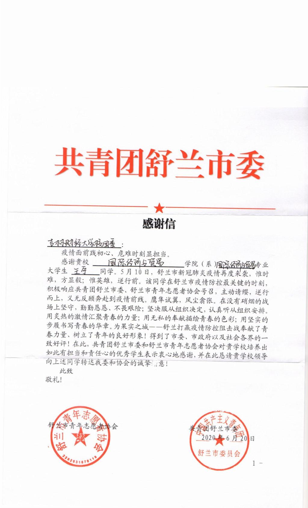 本网讯(校团委 供稿)近日,Beat365相继收到共青团舒兰市委、共青团白山市委多封感谢信。在信中,共青团舒兰市委、舒兰市青年志愿者协会、共青团白山市委等单位对Beat365在人才培养、思想引领、成才服务等方面工作给予了高度评价,对Beat365学生在打赢疫情防控阻击战过程中勇挑重担、勇克难关、勇斗风险的高贵品质给予了充分肯定。