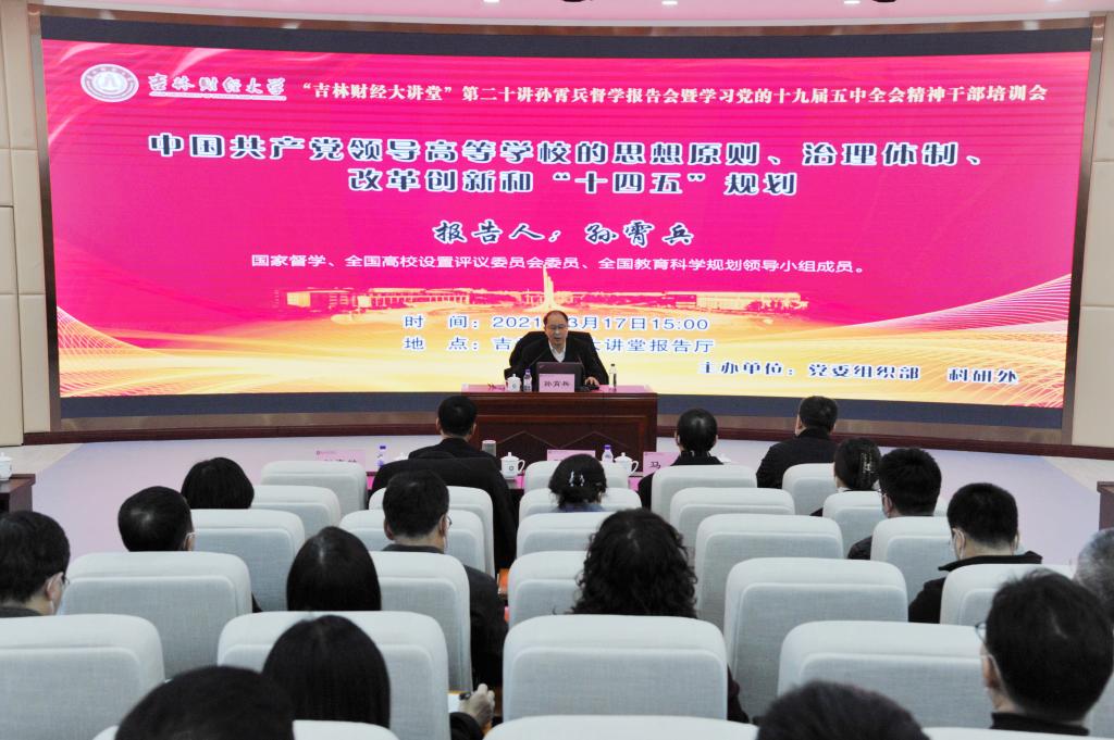 本网讯(科研处 供稿 摄影 宋寄玮 张玥)3月17日下午,全国高校设置评议委员会委员、全国教育科学规划领导小组成员孙霄兵督学应邀做客“吉林财经大讲堂”,在吉林财经大讲堂报告厅作了题为“中国共产党领导高等学校的思想原则、治理体制、改革创新和‘十四五’规划”的报告。会议由校党委副书记、校长孙杰光主持,校党委书记马尚、校党委副书记赵惠敏、副校长刘鹤出席了会议,学校全体中层干部、党委理论学习中心组(扩大)成员同时在线下线上参加了会议。