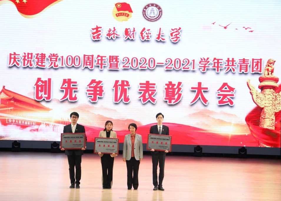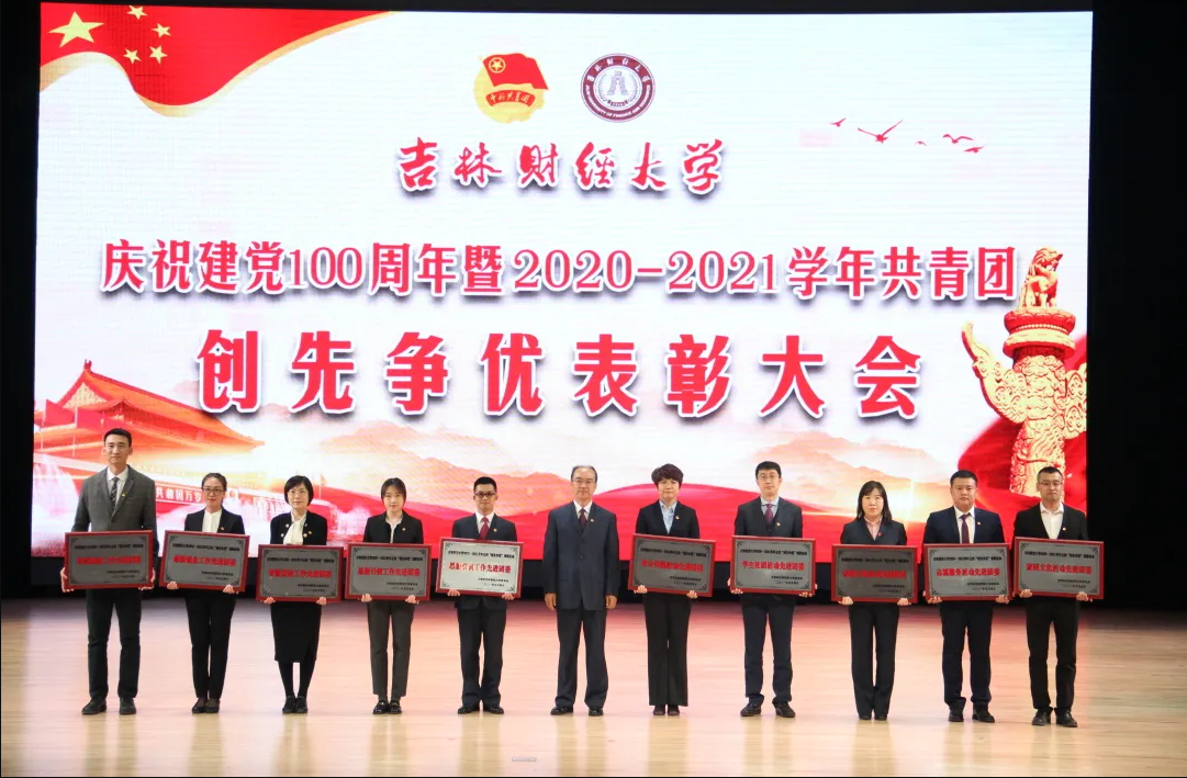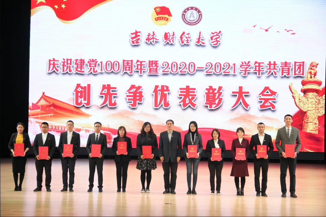 本网讯(校团委 供稿)为庆祝中国共产党成立100周年、纪念五四运动102周年,深入贯彻落实习近平总书记在党史学习教育动员大会上的重要讲话精神,表彰过去一年来在共青团工作中表现突出的先进集体和优秀个人,4月28日下午,Beat365在多功能学术中心举行了Beat365唯一官方网站庆祝建党100周年暨2020-2021学年共青团创先争优表彰大会。学校领导马尚、赵惠敏、邹永亮、岳宏、于金欢出席大会,相关党政职能部门负责人、直属单位负责人、教学单位党政负责人、全体学生工作人员以及获奖单位、个人和学生代表参加了会议。会议由校团委组织部部长张译丹主持。