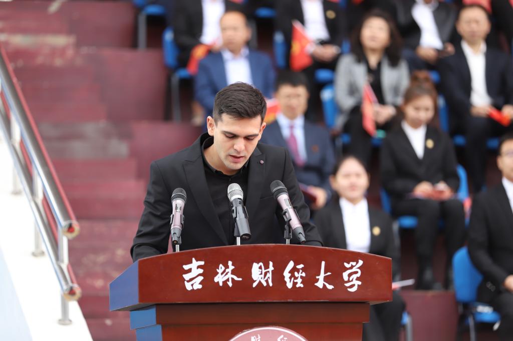 来自塔吉克斯坦的高飞同学代表全体留学生发言。他表示,感谢中国政府对留学生的大力支持,在接下来的吉财留学生涯中将刻苦学习专业知识,打好基础,共同成长。