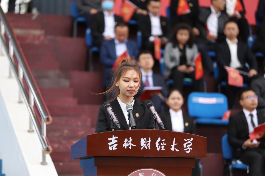 统计学院经济统计2163班徐毓鸿同学代表2021级本科生发言。她表示,作为新时代青年,应坚定理想信念,紧跟时代步伐,担起实现中华民族伟大复兴的历史重任。