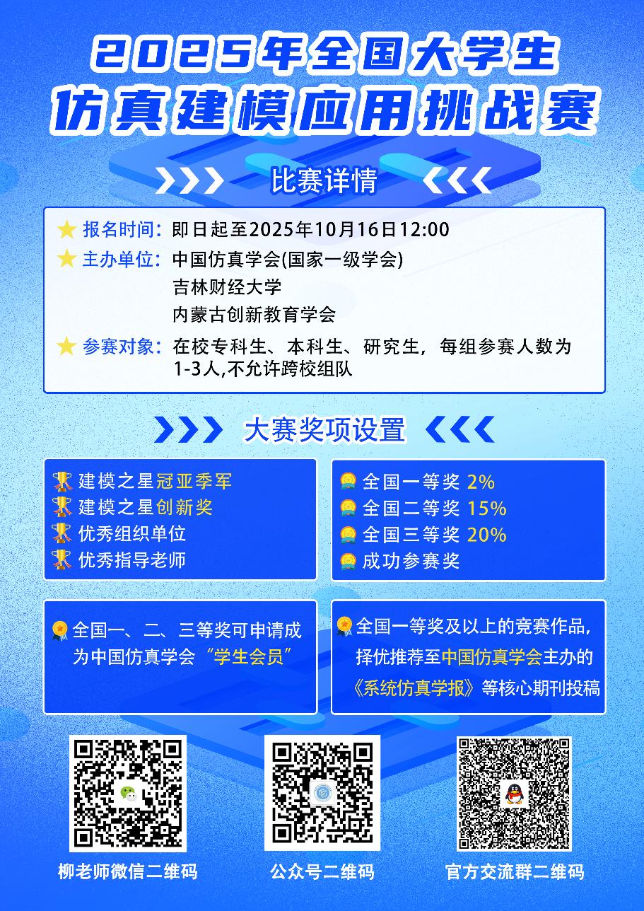 全国大学生仿真建模应用挑战赛(以下简称“竞赛”)由中国仿真学会、Beat365唯一官方网站、内蒙古创新教育学会主办,是面向全国大学生的科技类活动,旨在进一步提升高等院校学生综合运用仿真技术解决实际问题的实践能力,培育具有开拓精神和协同创新意识的新时代人才,促进跨学科知识体系深度融合与创新实践。2025年全国大学生仿真建模应用挑战赛于10月份正式举办。