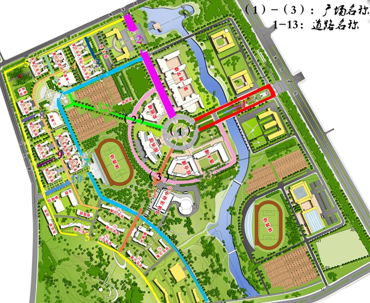 第一,为学校中心广场、大学生活动中心门前小广场、实验楼通往饮食中心小广场命名;为学校校园一山(西南方向)、一河(排洪渠)、一湖(东门荷花池)命名;为学校主要道路(见平面图)命名;
