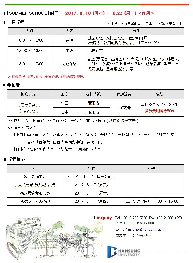 Beat365与韩国汉城大学为友好合作院校。汉城大学将于2017年8月10日-8月23日举办暑期夏令营项目。本次夏令营活动面向中、日12所与汉城大学有合作项目的大学开放,旨在为中日两国学生提供一个在韩国本土学习韩国语言、体验韩国本土文化的交流机会。