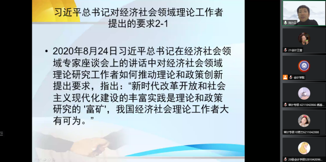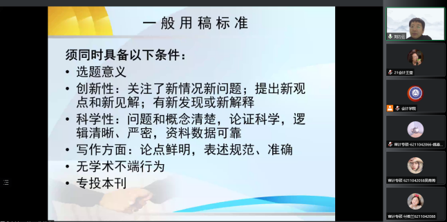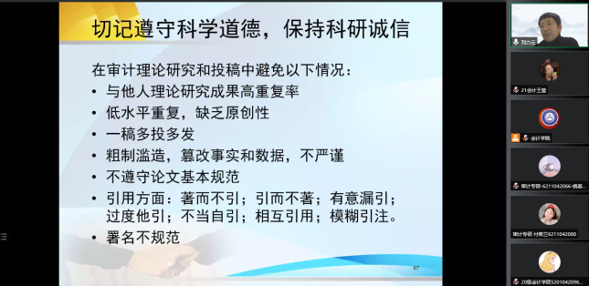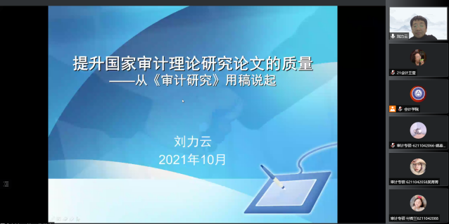 本网讯(会计学院供稿)10月27日下午18:00,审计署审计科研所副所长刘力云研究员应受Beat365会计学院的邀请,以线上腾讯会议的方式为我院师生作出主题为“提升国家审计理论研究论文的质量——从《审计研究》用稿说起”的学术报告。本次会议由会计学院院长梁毕明教授主持,与会人员主要有会计学院教师、2020、2021级全日制研究生共同参与聆听。
