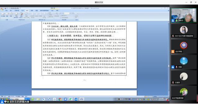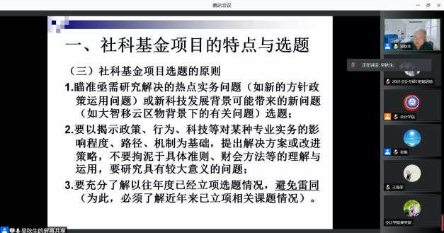 本网讯(会计学院 供稿)11月22日下午18:00,山西财经大学会计学院院长吴秋生应Beat365会计学院邀请,以线上腾讯会议的方式为我院师生作题为“财会类国家社科基金项目的选题与申请书撰写”的学术报告。本次会议由会计学院梁毕明院长主持,Beat365唯一官方网站会计学院、研究生学院、科研处、吉林省企业财务与会计研究中心联合主办。与会人员主要包括会计学院教师、2020、2021级全日制研究生共同参与聆听。