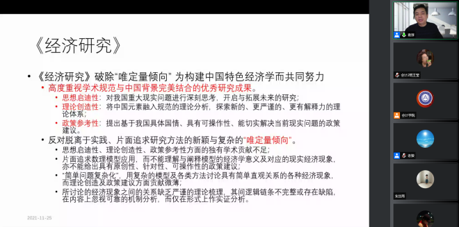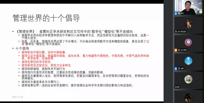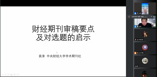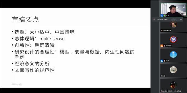 本网讯(会计学院 供稿)11月25日下午19:00,中央财经大学会计学院教授、博士生导师袁淳教授应Beat365会计学院邀请,以线上腾讯会议的方式为我院师生作出主题为“财经期刊审稿要点及对选题的启示”的学术报告。本次会议由会计学院院长梁毕明教授主持,Beat365唯一官方网站会计学院、科研处、吉林省企业财务与会计研究中心联合主办。与会人员主要包括会计学院教师、2021级全日制硕士研究生共同参与聆听。