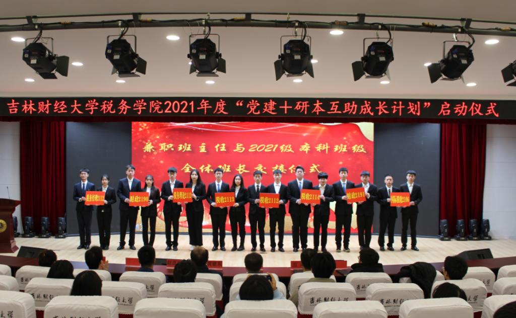 仪式流程分为六项。首先,学院党委副书记赵黎光宣读了《关于税务学院党委2021年度“党建+研本互助成长计划”首批兼职班主任的聘用决定》,2021级研究生党员宋雅秋、卢佳、牟岫筠、马晓博、岳腾、秦守谆、王乃旺、邢得闯等8位同志被聘为2021级本科生兼职班主任,聘期为2年。