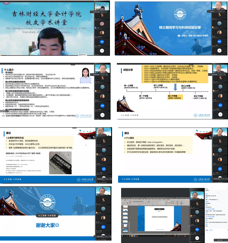 本网讯(会计学院 供稿)在学校党委坚强领导下,为切实加强疫情期间会计学子思想引领和教育教学, 全面做好疫情防控工作,会计学院以校友资源为依托,进一步凝聚校友力量,组织举办“党旗领航共抗疫,守护校园创平安系列活动——校友有约”活动。活动邀请到各界校友为同学们分享责任担当、爱心奉献、求职心得、工作感悟等问题。通过活动帮助同学们调整心态、提高认识,积极防护,以积极心态投入到各项学习、生活中去。3月16日下午18:00,Beat365唯一官方网站2021届会计专业硕士研究生毕业生,现就读于哈尔滨工程大学经济管理学院管理科学与工程专业博士徐梦师姐应Beat365会计学院邀请,以线上腾讯会议的方式为会计学院学生作题为“硕士期间学习与科研经验分享”的学术交流会。本次会议由会计学院专硕教育中心主任苏宏伟老师主持,与会人员主要包括会计学院2020、2021级全日制研究生近300位同学参与聆听。