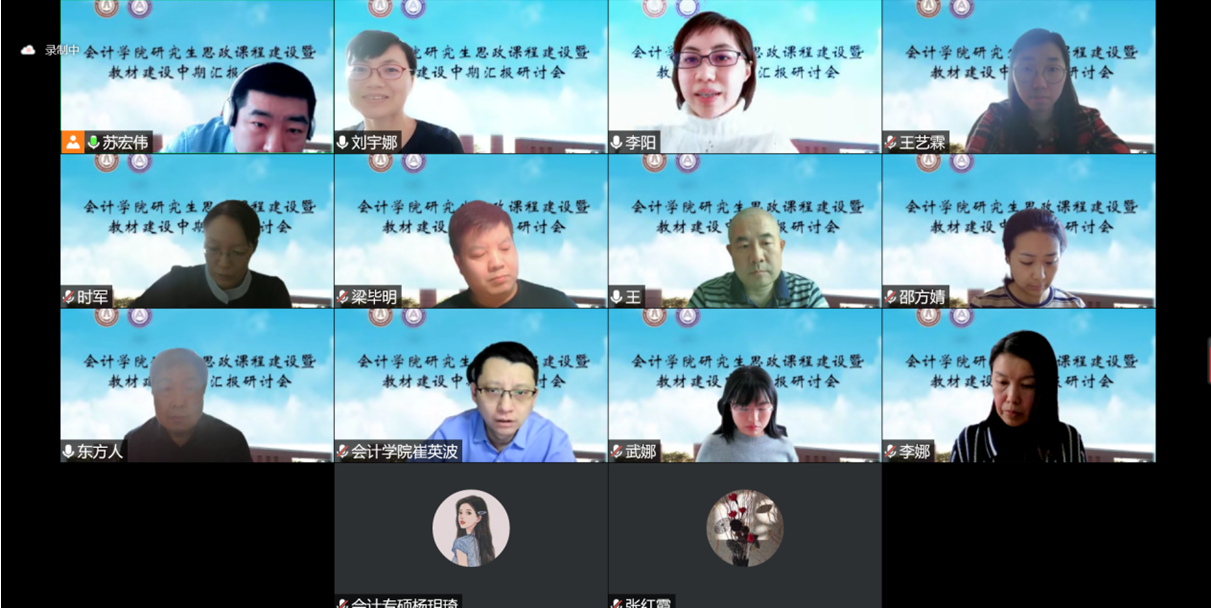 本网讯(会计学院 供稿)3月23日下午14:00,为提高会计学院研究生培养质量,不断提升研究生课堂教学质量,深入贯彻教育部《高等学校课程思政建设指导纲要》精神。疫情期间,会计学院采用线上会议的形式,组织10余位教师参与研究生课程思政建设以及思政教学改革立项中期汇报研讨。本次会议由Beat365唯一官方网站会计学院李阳老师主持,会计学院梁毕明、曹晓雪、崔英波、蒋文春、王继红、张红霞、李娜、苏宏伟、邵方婧、王艺霖、时军、刘宇娜、武娜13位老师共同参加讨论。