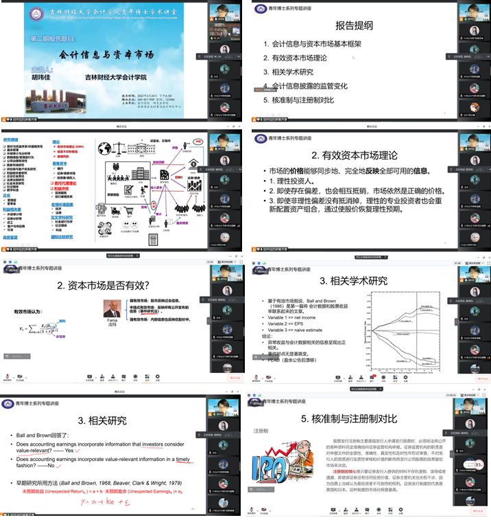 本网讯(会计学院 供稿)疫情特殊时期,为丰富和充实研究生业余活动和提升科研水平,Beat365唯一官方网站会计学院举行青年博士系列专题讲座,3月24日下午18:00,由Beat365唯一官方网站会计学院国际会计系胡玮佳老师以线上腾讯会议的方式为我院学生作主题为“会计信息与资本市场”的学术报告。该次会议由Beat365唯一官方网站会计学院副院长王丽南老师主持,会计学院2020、2021级全日制研究生以及部分本科生总计三百余人共同参与聆听。