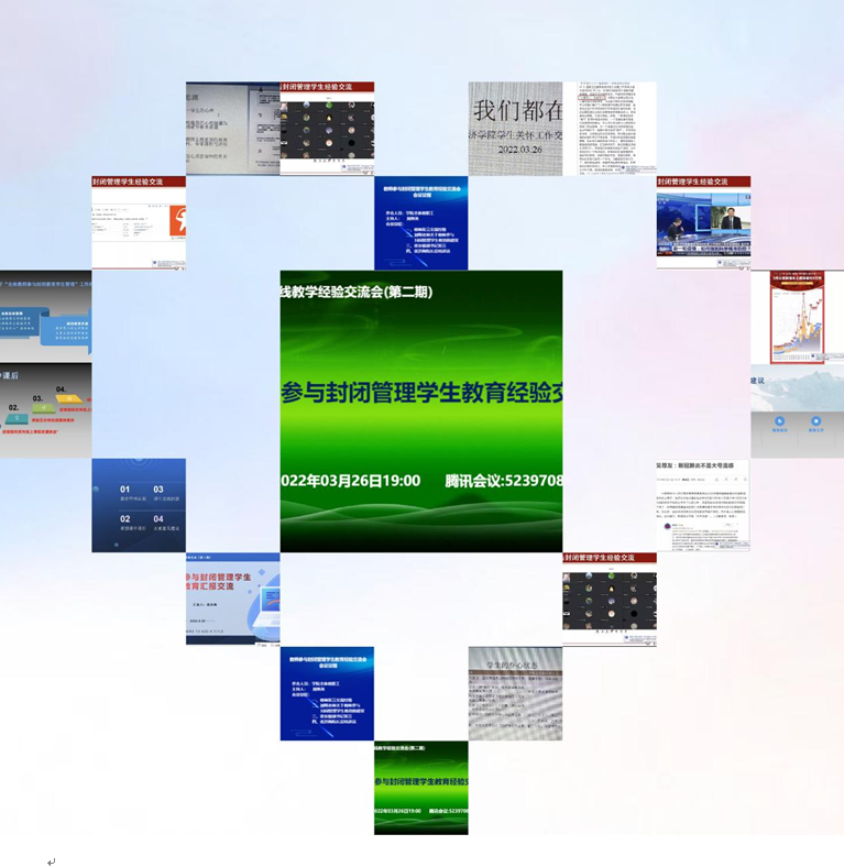 在“疫情期间系列线上课程资源推送”方面,既有专业领域的名师大咖学术报告以提升学生的经济学理论素养,也有系统性的心理疏导课程、科学防疫课程以舒缓学生的焦虑情绪,还有多种类型的电子书、纪录片、红色电影等资源以拓展学生们的知识视野,更有适合室内的多种体育运动以丰富学生们的课余生活。在“参与封闭管理学生”方面,三个小组针对不同年级学生的心理状态、学业情况与毕业去向等问题,有的放矢地采取不同方式与学生展开了交流。大家或者集中布置,分兵作战,实行精细化管理;或者借助过去的感情积淀,结合当下任务,引领学生将抗疫、学习、就业有机结合起来;或者通过身体力行,将自己的身边人、身边事与抗疫举措有机融合起来;或者通过贴心的匿名聊天形式,以短暂性陌生人身份,引导学生敞开心扉、吐露心声;或者通过小组为单位进行线上主题班会,师生分享抗疫感悟,互相鼓劲打气。在“课前五分钟抗疫精神宣讲”方面,老师们不仅将党和政府的抗疫领导,社会面的伟大抗疫精神和典型事例相结合,实现点面结合,重点突破,而且通过国际比较的方法用中国抗疫行动、专家对疫情的权威解读生动诠释中国特色社会主义的制度优势,也将全省人民众志成城、携手抗疫的生动实践和先进典型事迹与学生共享,更真切的将校内外感人抗疫故事讲给学生听,更加坚定了学生感党恩听党话跟党走的如磐信念。