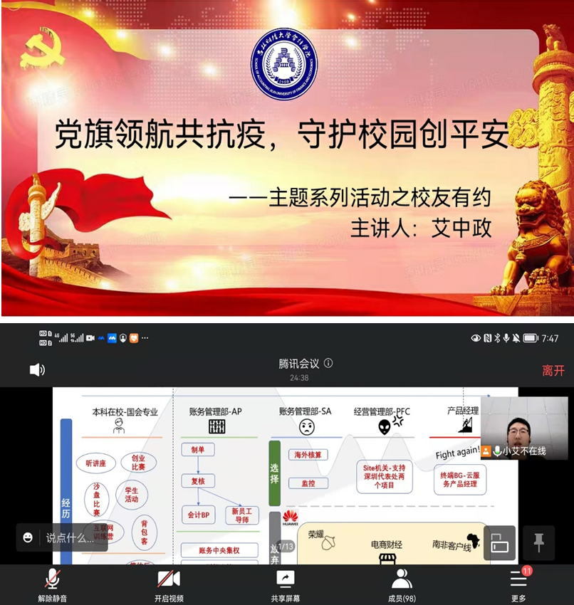 本网讯(会计学院 供稿)在学校党委坚强领导下,为切实加强疫情期间会计学子思想引领和教育教学, 全面做好疫情防控工作,会计学院以校友资源为依托,进一步凝聚校友力量,组织举办“党旗领航共抗疫,守护校园创平安系列活动——校友有约”活动。活动邀请到各界校友为同学们分享责任担当、爱心奉献、求职心得、工作感悟等问题。通过活动帮助同学们调整心态,提高认识,积极防护,以积极心态投入到各项学习、生活中去。3月27日晚19:30,会计学院在线上举办了“校友有约”活动。本次活动邀请到14级校友艾中政来为同学们进行职业的选择与发展主题的相关经验分享。学院近百名同学共同参与了本次活动。