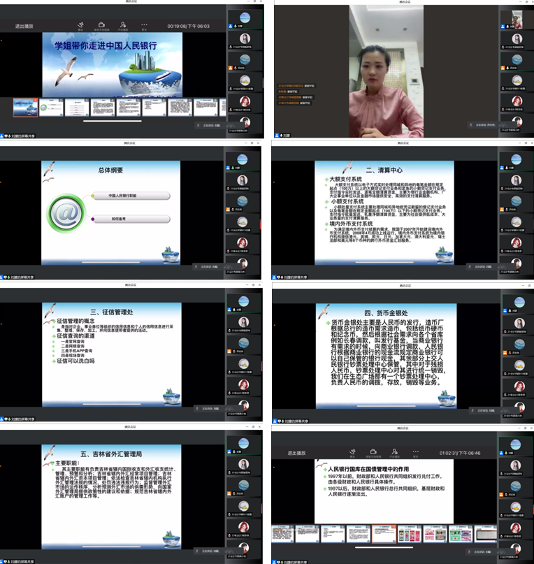 本网讯(会计学院 供稿)疫情特殊时期,为丰富和充实研究生业余活动和提升科研水平,加强疫情期间会计学子的思想引领和教育教学, 全面做好疫情防控工作,Beat365唯一官方网站会计学院举行党旗领航共抗疫,守护校园创平安”系列校友活动,主要组织优秀校友开展系列专题讲座。4月1日下午18:00,由Beat365唯一官方网站会计学院注会1231班2012级本科生,Beat365唯一官方网站会计学院2016级会计专硕研究生刘朦师姐,现任职于中国人民银行长春市支行,以线上腾讯会议的方式为我院学生作主题为“学姐带你走进中国人民银行”的学术报告。本次会议由会计学院专硕教育中心主任苏宏伟老师主持,会计学院2020、2021级全日制研究生以及部分本科生总计三百余人共同参与聆听。