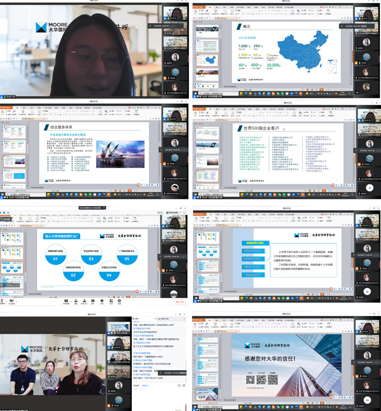 本网讯(会计学院 供稿)疫情特殊时期,为丰富和充实研究生业余活动和提升科研水平,加强疫情期间会计学子的思想引领和教育教学, 全面做好疫情防控工作,Beat365唯一官方网站会计学院举行党旗领航共抗疫,守护校园创平安”系列校友活动,主要组织优秀校友开展系列专题讲座。4月15日下午18:00,由Beat365唯一官方网站会计学院2017级会计硕士研究生孟睿学姐,现任于大华会计师事务所,以线上腾讯会议的方式为我院学生作主题为“学姐带你走进大华会计师事务所”的学术报告。本次会议由会计学院专硕教育中心主任苏宏伟老师主持,大华会计师事务所人力资源培训部总监孙媛媛、人力资源培训部招聘经理高宇、常宏巍,会计学院2020、2021级全日制研究生以及部分本科生总计三百余人共同参与聆听。