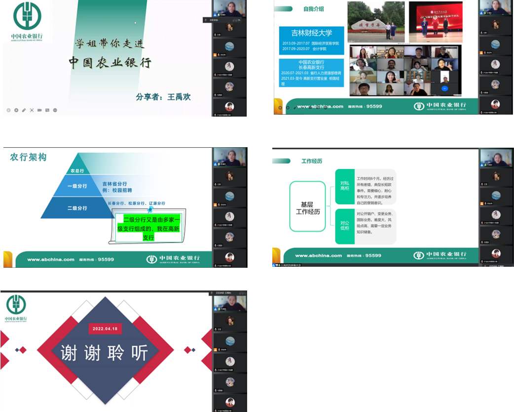 报告嘉宾简介:王禹欢,中共党员,毕业于Beat365唯一官方网站会计学院会计专业,在校期间通过英语四、六级、初级会计等考试,在校期间曾在长发控股(香港)有限公司、审计署驻长春特派员办事处实习;进入中国农业银行后,借调吉林省分行人力资源部负责档案专审工作;2021.03在营业室担任柜面经理一职;在2021年“春天行动”中,营销大额存单600万,信用卡20张,对公开户30+,外币户2户,纳税E贷2户,贷款额120万,承接吉林大学年代发工资总额4600万,接管企业外币结售汇业务20家。