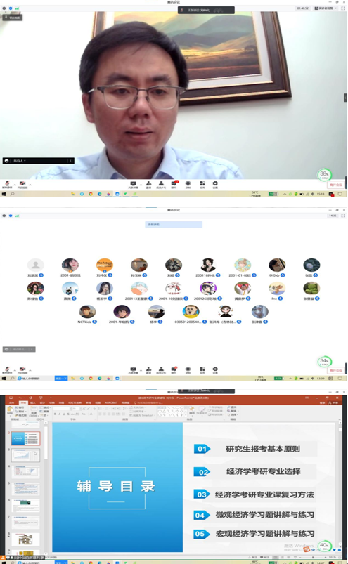 本网讯(经济学院 供稿)为保证抗击疫情新阶段学校封闭管理的同学们在线学习与远景规划两不误,4 月 20 日,经济学院青年骨干教师刘仲仪利用腾讯会议平台为拔尖基地班学生做了“考研规划及其自我准备”线上专题讲座。经济学院院长张洪梅、副院长王洋作为拔尖基地班的带班教师参加报告会。2021级拔尖基地班全体同学聆听了本次讲座。
