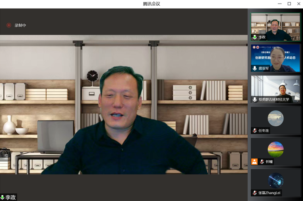 本网讯(亚泰工商管理学院 供稿)近日,由亚泰工商管理学院主办,科研处、吉林省服务业研究基地、吉林省企业管理创新研究中心、创新创业研究中心联合承办的题为《创新研究前沿理论与学术动态》的学术报告在腾讯会议线上举行。此次报告由吉林大学“匡亚明学者”领军教授李政教授主讲,亚泰工商管理学院科研副院长盛亚军主持,学院全体教师及其他校内外教师参加了会议。