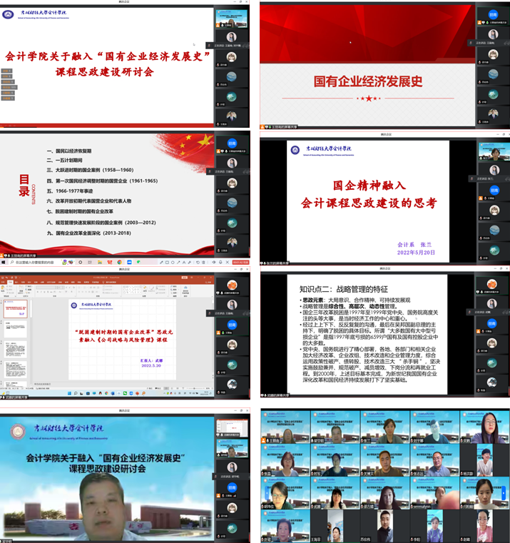 课程思政建设研讨会上由会计学院会计系主任张兰、武娜两位教师,分别作“国企精神融入会计课程思政建设思考”、“脱困建制时期的国有企业改革思政元素融入《公司战略与风险管理》”经验分享,两位老师就自身在对课程思政实践探索做分享和交流,重点从会计学科知识点角度解读国有企业改革思政精神,结合国企改革相关案例,针对学科特点向课程中融入思政元素。最后,梁院长为本次研讨会作总结发言,要从国家双一流专业建设为契机,以及满足会计学院学科发展的需要,有效地把国有企业经济发展史融入到学院课程思政中。将特定知识点融入思政、养成思政教学习惯、培养思政意识,形成学科思政特点,通过学院师生不断完善、共同努力取得课程思政建设的实质性结果。(审核人 梁毕明)