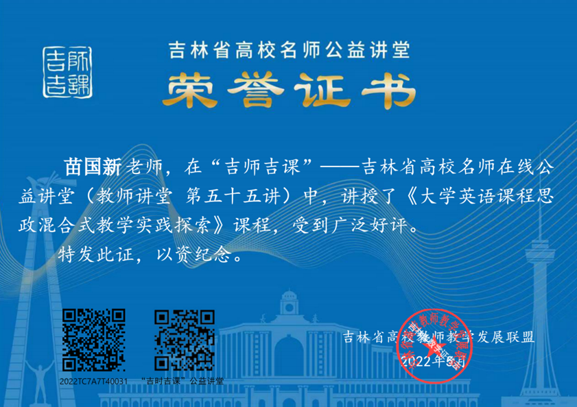 本网讯(公共外语教研部 供稿)为提升线上教学质量,化解教育教学改革痛点、难点问题,吉林省教育厅推出“吉师吉课”吉林省高校名师线上公益讲堂,通过聚焦线上教学实践经验、课程思政建设分享、混合式教学模式改革,解决教师热切关注的问题,受到广大教师的广泛关注。