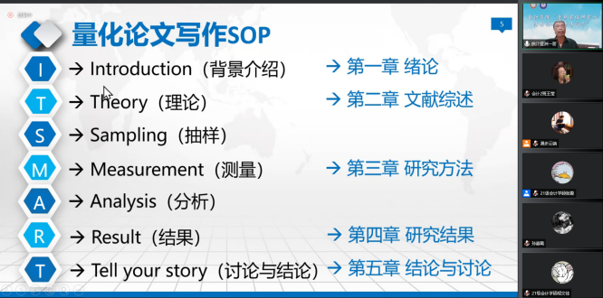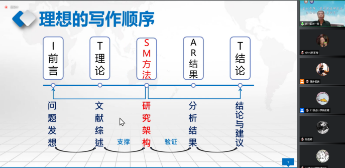 “暑期实证研究方法与论文写作集训营”第一次启动课由北京巨大量化科技有限公司董事长张伟豪老师做实证研究方法总体指导。张伟豪老师指出论文写作要掌握正确的方法,走在“正确”的道路上会事半功倍,并且要善于运用相应工具,提高写作效率。张伟豪老师通过讲述ITSMART整个论文写作的指导性框架,以个人多年论文经验开展自己的独特见解,将其量化为背景介绍、理论、抽样、测量、分析、结果以及讨论与结论等方面。其中,理论与结论是文章的精髓,建议广大师生先建立起研究框架,以其为中心,文献综述与前言作为架构的支撑,分析结果与结论建议作为架构的验证,提高文章写作的效率与质量。张老师将研究方法分为研究架构、研究假设、问卷发展、研究对象与统计分析等方面,围绕各个层面详细展开,并以全球量化研究网为例,为各位师生演示如何快速查询、筛选数据。随后,将文献综述、绪论等架构的支撑部分进行详细解读,把分析结果与结论建议等架构的验证部分剖析演示。本次写作集训营对我院师生系统掌握知识、探讨前沿社会问题、掌握数据分析的基本能力提供了极大帮助,有利于提高会计学院师生定量研究的水平以及整体能力。(审核人 梁毕明)