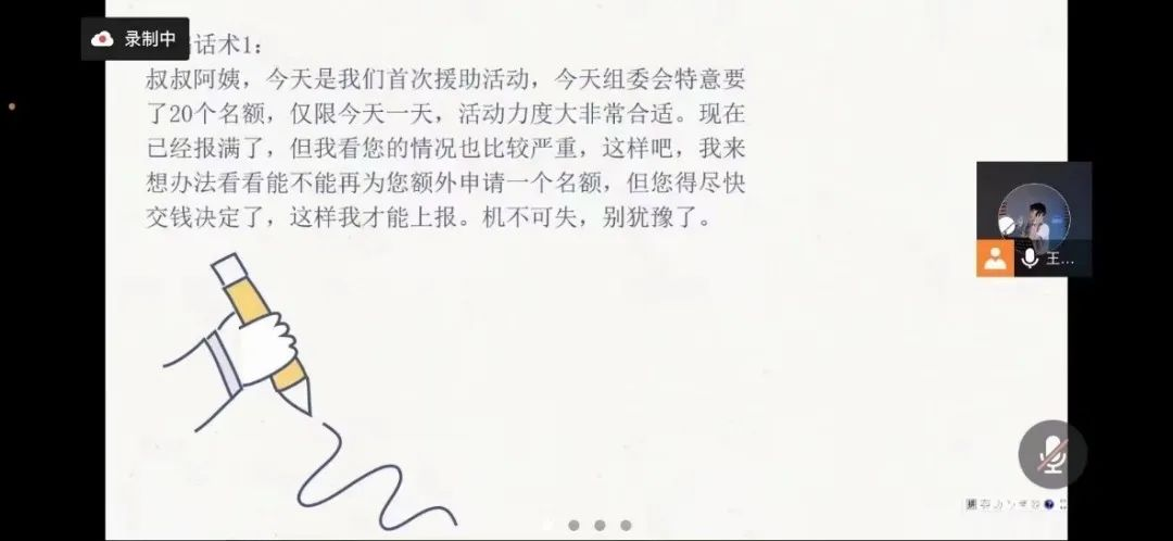 在严格落实当地疫情防控工作要求的基础上,为切实保护老年人的合法权益,夯实防范诈骗的安全法律意识,马纪瑶,魏新骏,魏子钧三名同学提前搜集了解当前诈骗新手段以及防诈攻略、技巧,相关案例等材料,王姝力同学将其制作成PPT并向迎花村的爷爷奶奶们进行防诈骗宣传,包括一些日常生活中常见的诈骗案例。反诈宣讲采取视频加文字相结合的方式,可以更加清楚生动地向迎花村的老人们进行反诈宣传,帮助老人们掌握反诈攻略,增强法律意识和安全意识,幸福的老年生活更加有了保障。