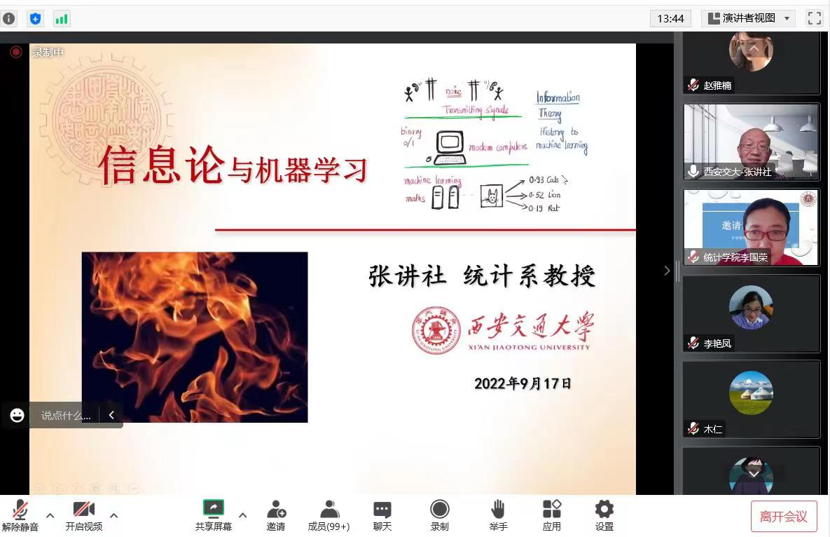 本网讯(统计学院 供稿)9月17日上午,为进一步拓展科学研究视野,提高师生对于机器学习相关研究的兴趣,应Beat365统计学院邀请,西安交通大学数学与统计学院张讲社教授通过腾讯会议为全院师生作了“信息论与机器学习”学术报告会议。本次会议由统计学院院长李国荣主持,统计学院青年教师及研究生共同参加了此次会议。