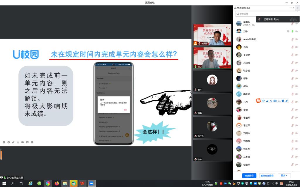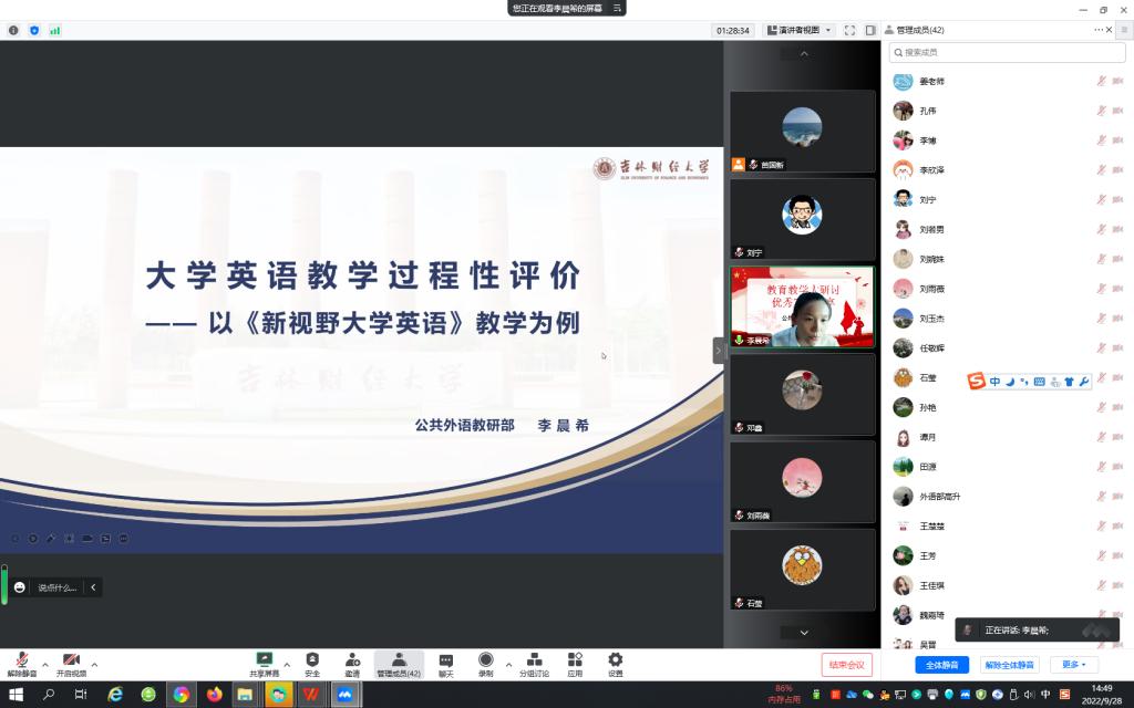 接着,公共外语教研部刘宁、刘雨薇、石莹、李晨希分别从各自的教学实践,依托大学英语系列课程从U校园智慧教学平台的使用、BOPPPS教学模式的应用、互动式教学方法以及多元过程性评价等方面做了分享。