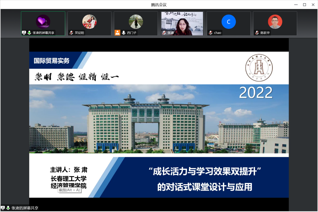 会议过程中,张肃教授主要以《国际贸易实务》课程为例,详细阐述其对话式课堂的设计思路与应用方法,以及实现混合式教学中学生成长活力与学习效果双重提升的内在逻辑和动力机制。首先,张肃教授从教师普遍面临的教学痛点入手,深入阐释如何读懂学生、读懂学习,指出课堂教学改革的重点在于将传统型知识输入转变为思维产出。之后,张肃教授基于对《国际贸易实务》课程改革的多年实践经验,详细分享其课程“‘一心六翼’混合式课堂——‘同步+异步’在线混合式课堂——BOPPPS+PBL混合式课堂”的进阶历程,尤其重点解读了对话式课堂建构的核心要义,以及对传统课堂教学痛点的回应和破解。最后,通过展示历届学生的课堂评价成绩和学习成果,张肃教授深刻总结了对话式开放课堂及其多元化课堂评价方式不仅可以显著提升专业学习效果,更能够激发学生成长的内在动力,而这正是教育目的本身对于课堂教学改革的本质呼唤。在随后的交流提问环节中,张肃教授围绕本次报告主题同参会教师作了深入探讨,就青年教师所提出的混合式课堂内外资源整合以及如何调动学生学习内驱力等问题进行了细致耐心的解答。