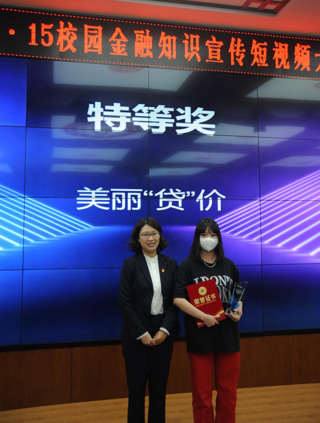 王丽颖和孟爽在颁奖仪式上致辞,对本次活动给予了高度评价,对学生参赛积极性和参赛成果高度肯定,对双方的进一步合作确定了方向。本次大赛包括作品征集、投票评选和颁奖仪式三个环节,在前期的作品征集环节中,学院共有167名学生组成了多支参赛小组,通过认真的学习和对金融消费者权益保护知识的讨论研究,提交了32个内容新颖详实、各具创意的短视频作品。中国银行长春朝阳支行和金融学院共同组成了大赛评审团,评选出特等奖一项、一等奖一项、二等奖三项、三等奖五项、优秀奖十项、最佳人气奖和最佳创意奖各一项。活动中,银行工作人员及学院老师面向同学进行了金融知识宣讲和有奖知识问答。