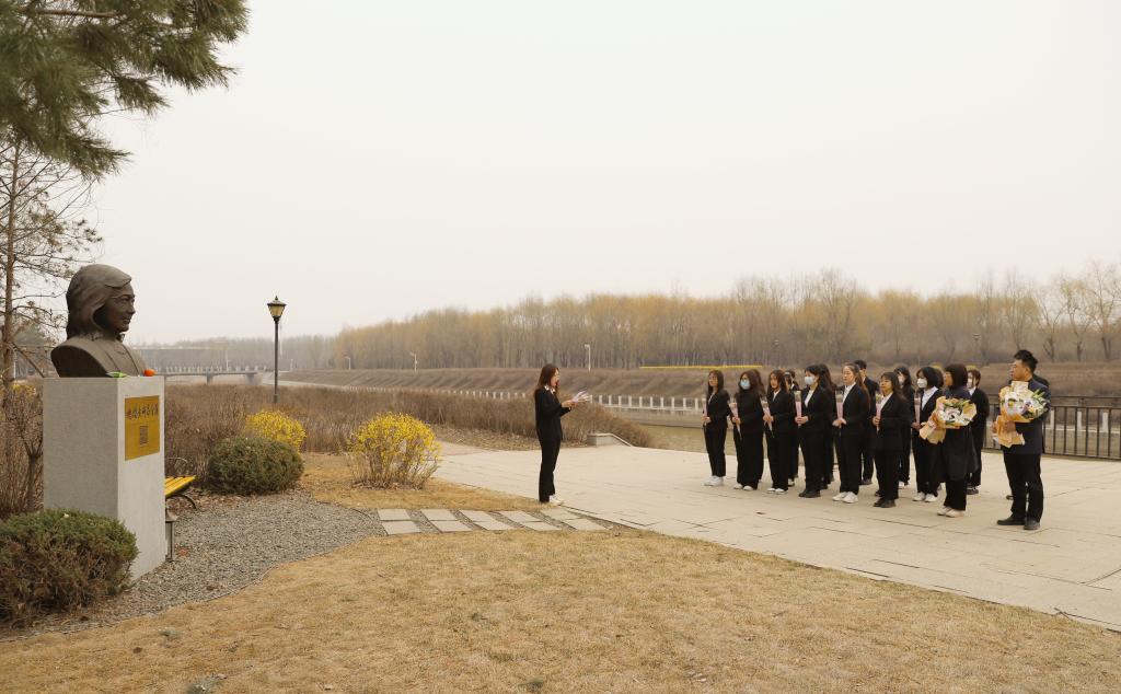 本网讯(党委宣传部 供稿)又是一年清明时,春风落日寄哀思,为表达对吕金华老师的敬仰和缅怀,4月4日早,校大学生记者团和新媒体联合会学生代表向坐落在校园“记者林”旁的“妈妈老师”吕金华塑像敬献花束。党委宣传部李栋栋、于茹两位老师参加仪式,仪式由大学生记者团团长王艺儒主持。