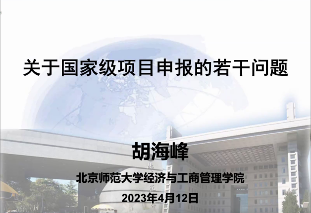 本网讯(会计学院 供稿)4月12日,会计学院举办2023年“两金”项目申报系列(线上)辅导会,本次辅导邀请北京师范大学经济与工商管理学院金融系主任、博士生导师胡海峰教授作“关于国家级项目申报的若干问题”的专题报告。报告会由学院院长梁毕明主持,学院教师及2021级、2022级全日制研究生参加会议。