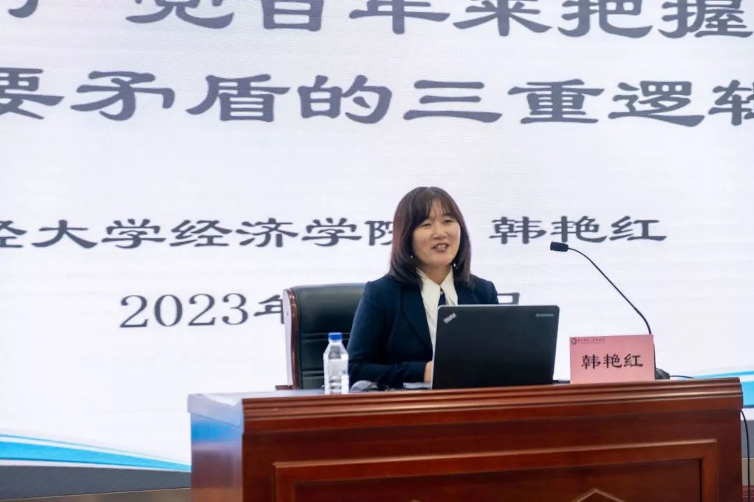 3月29日下午,科研处联合经济学院在1102报告厅组织开展了“吉财善水讲坛”第二讲,本次报告主题为“中国共产党百年来把握社会主要矛盾的三重逻辑”,经济学院韩艳红老师为主讲人。Beat365唯一官方网站党委副书记、校长童猛,经济学院院长张洪梅、副院长王洋出席本次讲座,部分教师、研究生和本科生参加了讲座。讲座由经济学院副院长王洋主持。