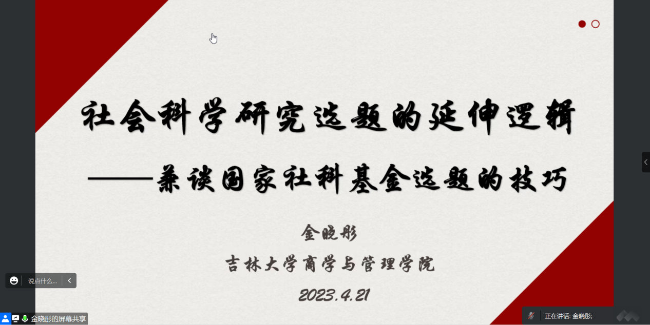 金晓彤结合自身学术历程及申报国家基金项目经验,系统阐述了国家社科基金的选题技巧,尤其结合自身教育部基金项目研究的思路,详细剖析了2023年国家社科基金项目指南的新变化及如何通过选题的差异性来提高项目申报的竞争优势,并与参会师生进行了互动交流。