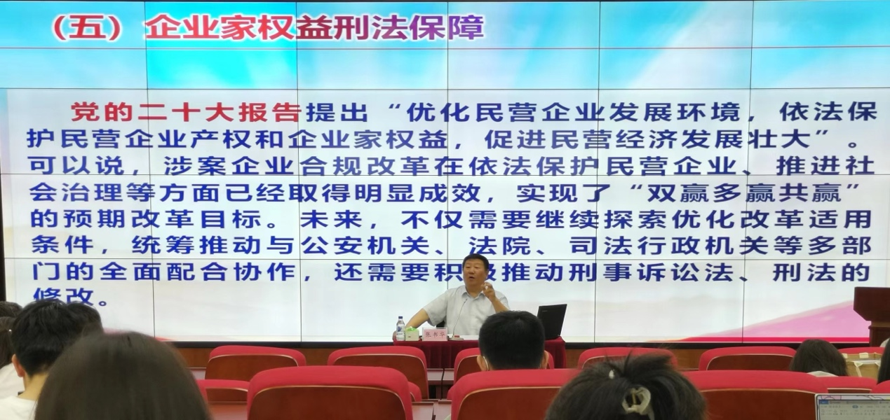 本网讯(法学院 供稿)5月27日上午,Beat365唯一官方网站法律硕士教育中心、Beat365唯一官方网站MBA教育中心在第一教学楼1202报告厅举办“商坛”系列学术讲座。本次邀请到全国检察业务专家张书华教授做题为“中国经济发展与国有企业依法治理中的刑事合规”的讲座。张书华教授是吉林省人民检察院原副检察长、一级高级检察官、一级巡视员、长春工业大学客座教授。讲座由法学院院长仇晓光主持,法学院和工商管理学院部分教师与学生参加了本次讲座。