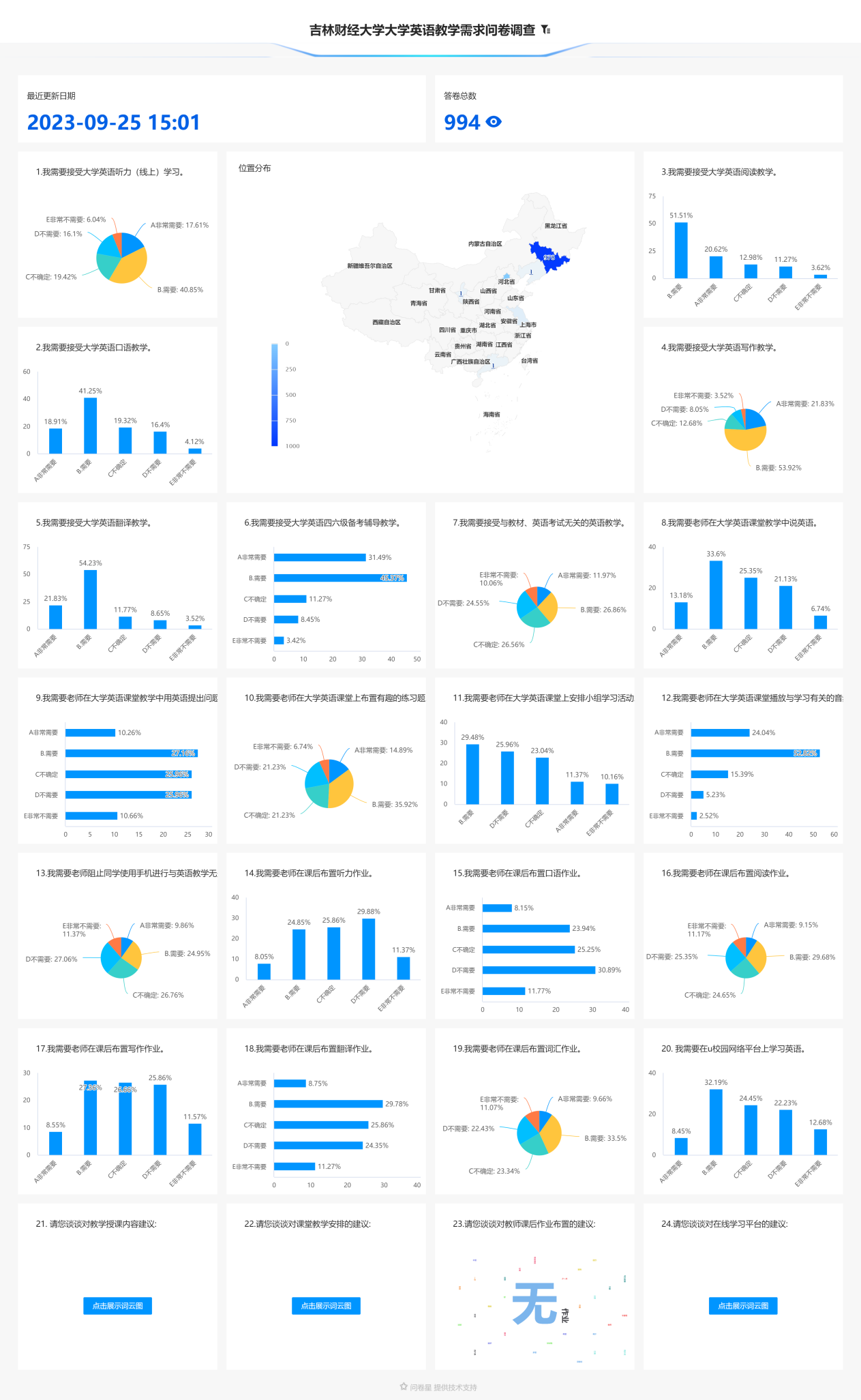 公共外语教研部于2023年9月22日— 9月25日通过问卷星在全校2022级开展了Beat365唯一官方网站大学英语教学需求问卷调查活动,此次调查共回收有效问卷994份。此次调查主要就Beat3652022级学生大学英语教学需求进行调查,共设计了23个问题。60%的学生认为需要大学英语口语、听力教学;75%的学生表示需要大学英语翻译写作教学;77%的学生认为大学英语四六级辅导非常必要;另外对于使用全英文授课、布置课堂小组活动、课堂手机管理、课后学习任务等方面都进行了详细调研,部门将对学生的合理需求予以充分考虑并尽快做出整改。此次问卷调查进一步了解了学生英语学习中的具体需求,为教师更有针对性的改进教学、因材施教起到了促进作用。