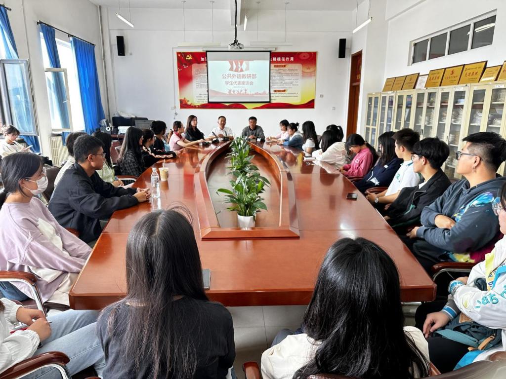 2023年9月22日中午12:30,在公共外语教研部会议室召开了本学期2022级学生代表座谈会。公共外语教研部党总支书记张文东、公共外语教研部主任苗国新、公共外语教研部副主任赵书博、公共外语教研部第一教研室主任石莹、教学秘书詹克磊、科研秘书姜楠以及40名学生代表参加了此次座谈会,会议由公共外语教研部副主任赵书博主持。
