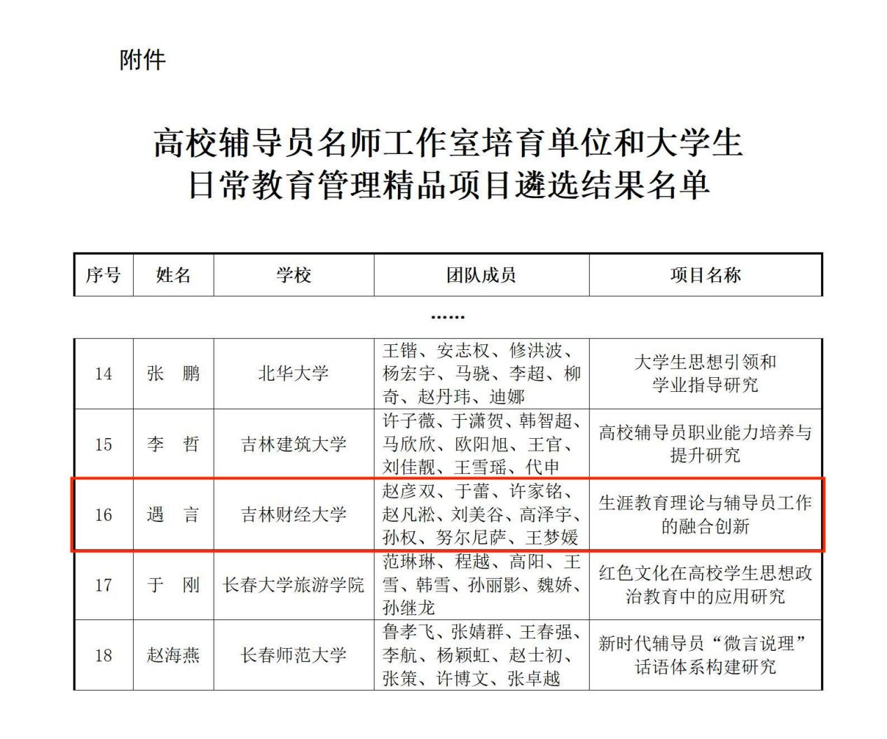 本网讯(党委学生工作部 供稿)近日,吉林省教育厅公布了《关于开展高校辅导员名师工作室培育单位和大学生日常教育管理精品项目遴选工作的通知》。经学校党委推荐、吉林省教育厅专家评审和公示等环节,Beat365辅导员遇言及其团队项目“生涯教育理论与辅导员工作的融合创新”获评高校辅导员名师工作室培育单位和大学生日常教育管理精品项目。