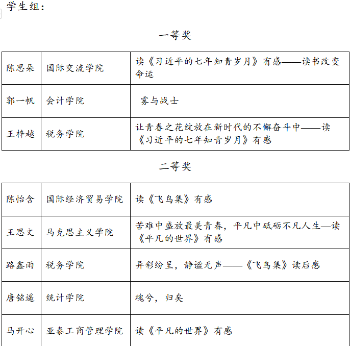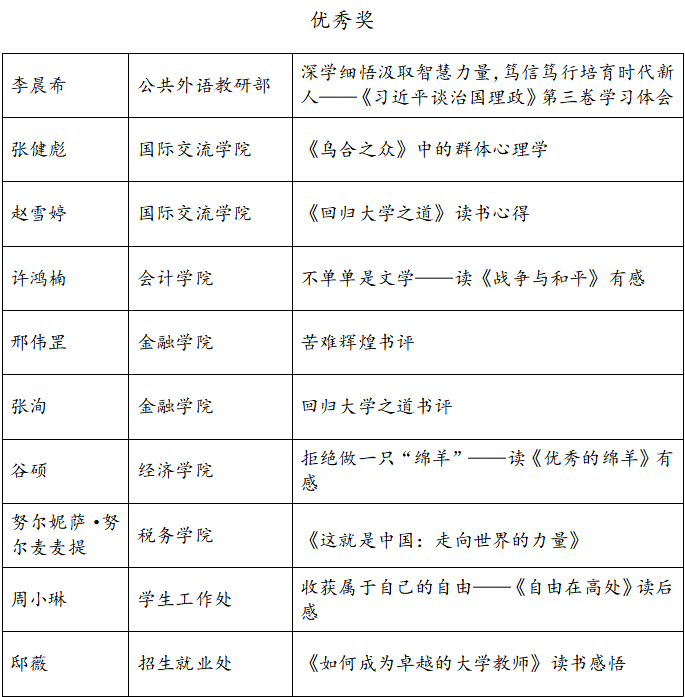 活动启动后,图书馆、学生工作处、校团委、教务处、研究生学院、教师教学发展中心等部门联合举办了“书香激扬青春”读书心得征文大赛,共收到教师征文29篇,学生征文308篇。活动主办单位严格按照征文评审办法,严格遵照查重、盲审、初审和复审等评审程序,评选出教师组一等奖2名,二等奖3名,三等奖5名,优秀奖10名;学生组一等奖3名,二等奖5名,三等奖8名,优秀奖15名。