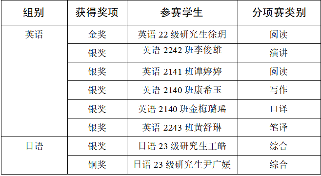 在英语组省赛各赛项的激烈竞争中,我院2022级英语专业研究生徐玥获得吉林省赛区金奖,晋级国赛;2022级本科生李俊雄、黄舒琳分获演讲比赛、笔译比赛银奖;2021级本科生谭婷婷、康希玉、金梅璐瑶分获阅读比赛、写作比赛、口译比赛银奖。