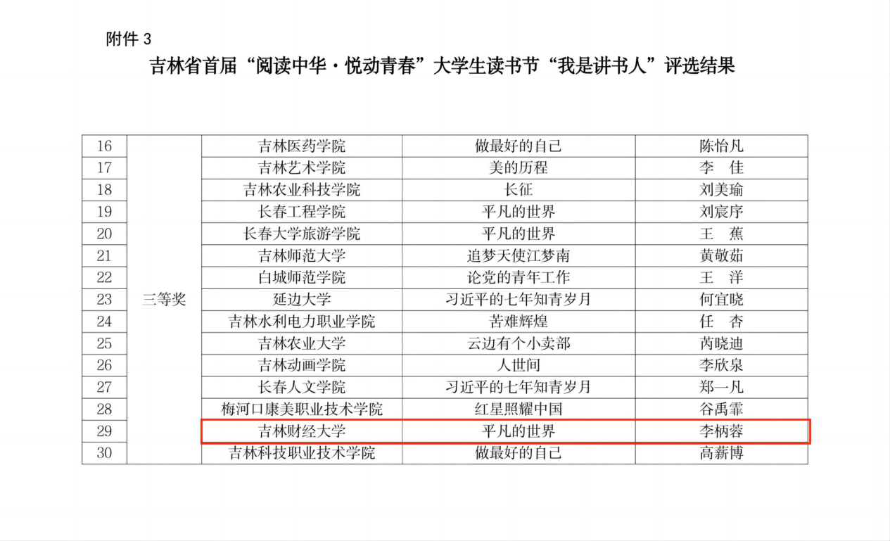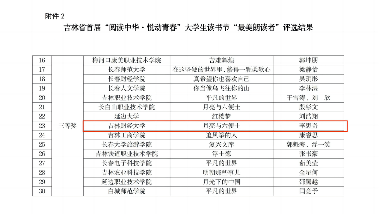 本次读书节活动由吉林省教育厅主办,旨在激发大学生阅读兴趣、拓展阅读视野、提升阅读素养、培养思维能力、助力价值观塑造,活动期间共收到全省高校报送作品776个。经专家评审,确定“最美阅读空间”“最美朗读者”“我是讲书人”等系列活动一等奖各 5 个、二等奖各 10 个、三等奖各 15 个。(审核人 赵彦双)